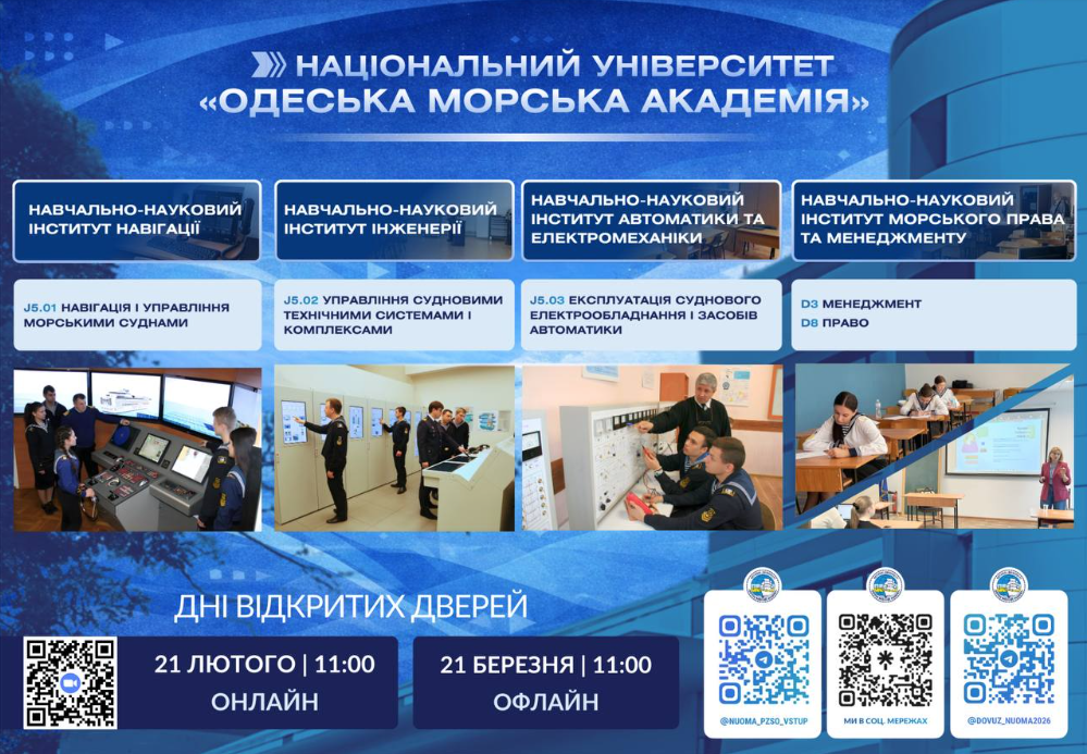 День відкритих дверей НУОМА Національний університет «Одеська морська академія» запрошує учнів 10-11 класів, батьків та всіх зацікавлених на онлайн-зустріч – «День відкритих дверей НУОМА»!
